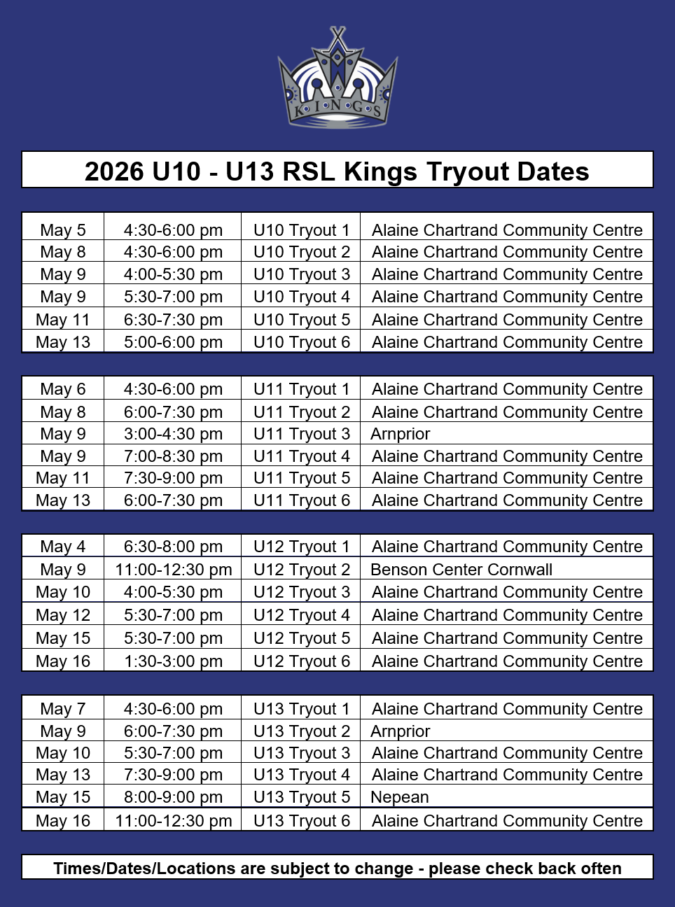 2026 Spring TRYOUT Schedule